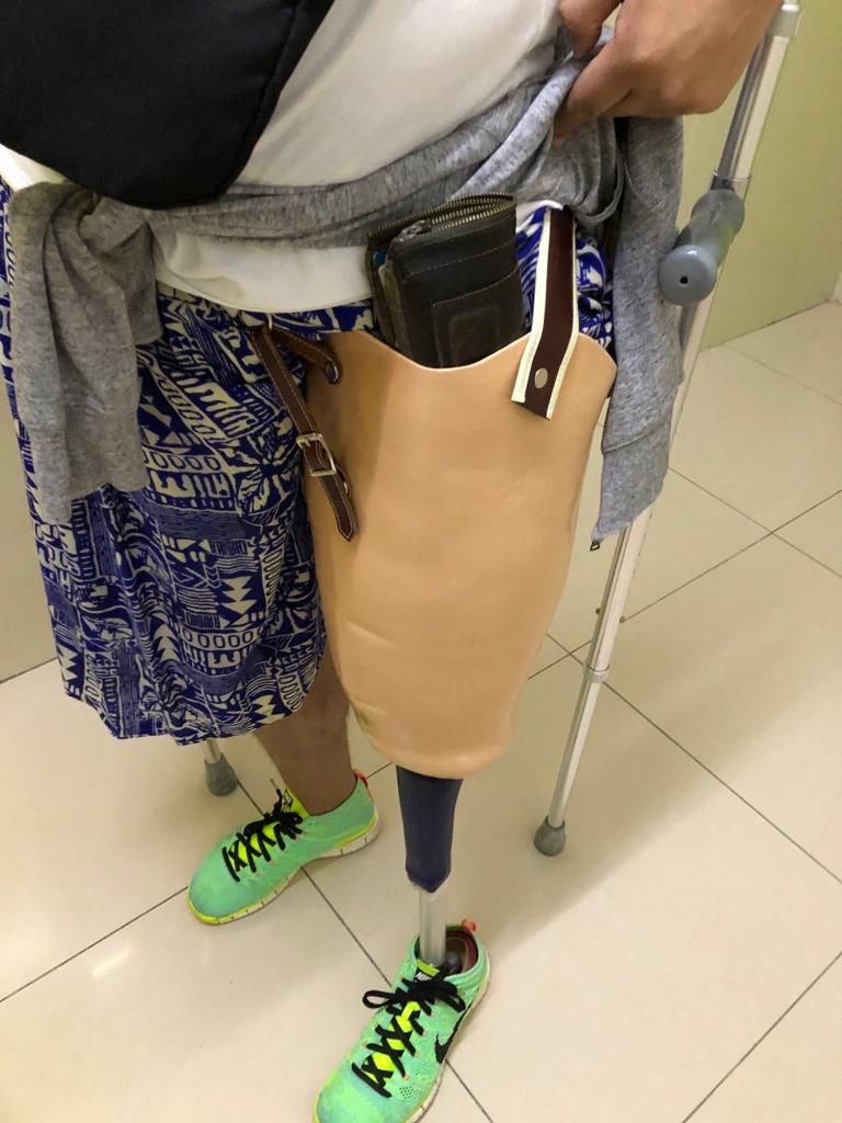 他第一次用的義肢是政府有免費名額資助的,可是那義肢做得並不好,他笑言義肢與腳中間有很寬闊的空隙,幾乎可以放進銀包和電話,穿上這義肢後,連大胖子的褲子也穿不上。他的第一隻可用的義肢是一位矯形師幫他做的,初時義肢只可以彎曲,但腳一曲他就會跪低,後來改良得安全一些,換了在合適的角度才可彎曲的,而且有一點阻力,令他適應得更好。當時他努力做運動,不想令肌肉萎縮,他也努力學習使用義肢。「跌低了努力再站起來!」他就是常常這樣勉勵自己的。